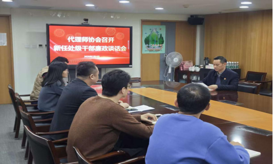 近日,代理师协会召开新任干部廉政谈话会,协会党总支部副书记兼纪检委员、副秘书长曾凡夫主持谈话,5位新任干部参加。